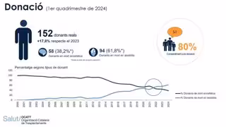 Amb motiu del Dia Mundial del Donant d'rgans i teixits aquest dimecres, Tort ha atribut aquest increment de trasplantaments als 152 donants cadver obtinguts en els primers quatre mesos del 2024, que representen un 17,8% més respecte al 2023, així com als 59 donants vius i a l'intercanvi d'rgans amb altres territoris d'Espanya.