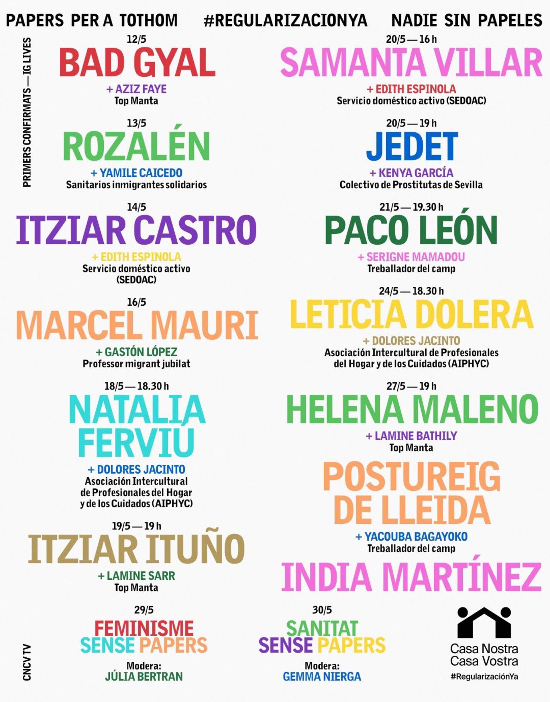 Casa Nostra Casa Vostra (CNCV) ha iniciat una srie de converses a Instagram Live i Youtube entre persones sense papers i personalitats de la cultura com l'actor Paco León, la cantautora Rozalén, la periodista Gemma Nierga i la cantant Bad Gyal, que va estrenar el format el 12 de maig amb Aziz Faye, de Top Manta.