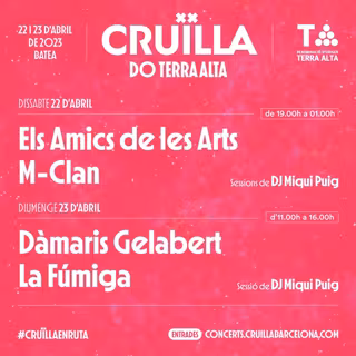 La primera edició del festival Cruïlla DO Terra Alta, que se celebrarà a Batea (Tarragona) el 22 i 23 d'abril, comptarà amb Els Amics de les Arts, M-Clan, Dàmaris Gelabert, La Fúmiga i Miqui Puig.