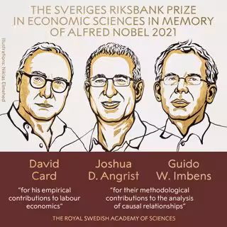 Els economistes David Card, Joshua D. Angrist i Guido W. Imbens han estat guardonats amb el Premi de Cincies Econmiques del Banc de Sucia en memria d'Alfred Nobel, conegut popularment com Nobel d'Economia, segons ha anunciat aquest dilluns la Reial Acadmia Sueca de Cincies.