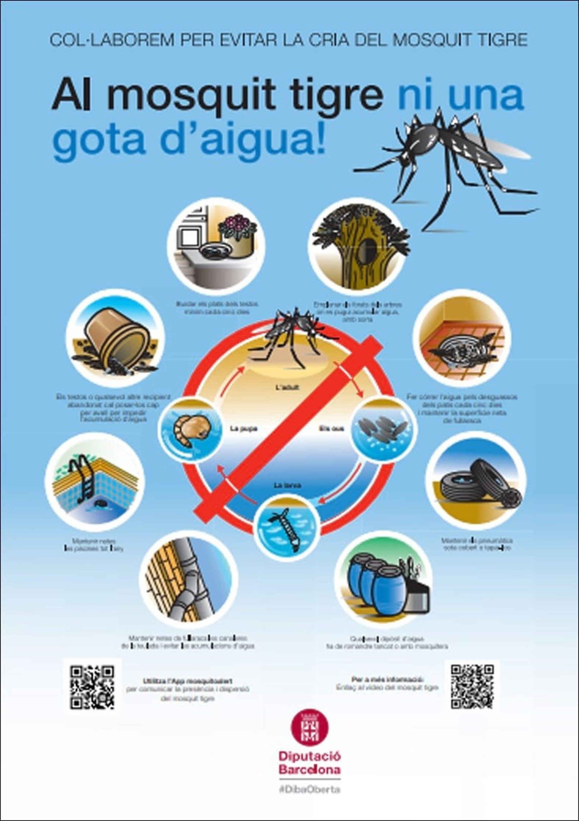 Per sensibilitzar a la ciutadania, el Servei de Salut Pública de la Diputació de Barcelona posa a la disposició dels ajuntaments diversos materials com un vídeo --amb una versió llarga i una altra curta-- i un cartell amb l'eslgan 'Al mosquit tigre, ni una gota d'aigua'.
