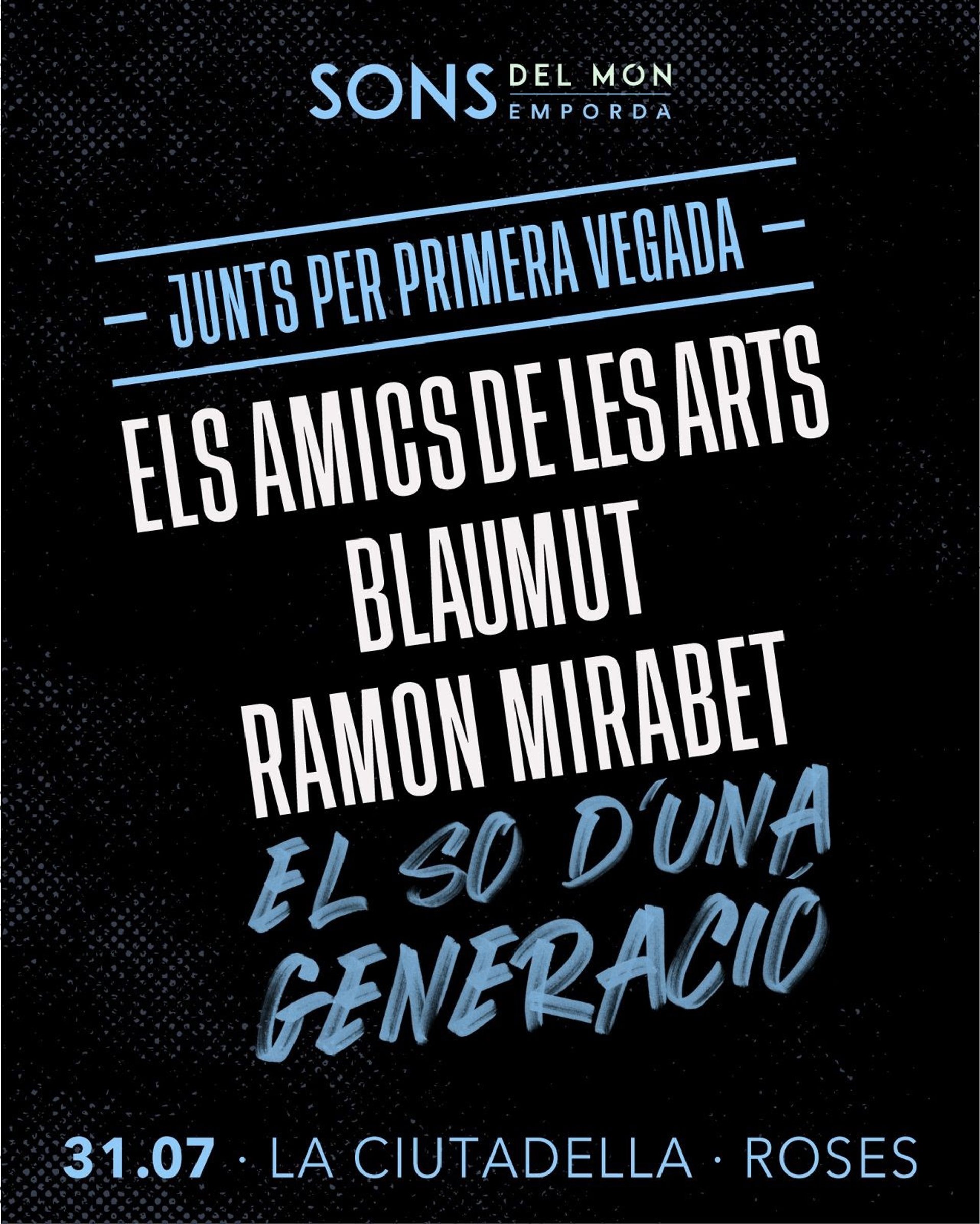 Les bandes catalanes Els Amics de les Arts, Blaumut i Ramon Mirabet protagonitzaran una de les nits del Festival Sons del Món de Roses (Girona), en una jornada el 31 de juliol que s'ha batejat com 'El so d'una generació', informa aquest dilluns en un comunicat.