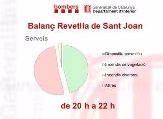 Els Bombers de la Generalitat han rebut 67 avisos per incendis i altres incidents a Catalunya entre les 20.00 i les 22.00 hores d'aquest dimarts a la nit, revetlla de Sant Joan, un centenar menys que els registrats l'any passat a la mateixa franja horria.