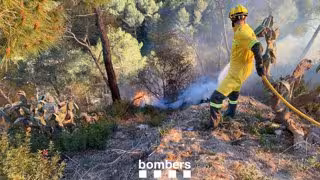 Els Bombers de la Generalitat treballen aquest diumenge a la tarda amb 13 dotacions i un helicpter en un incendi en una zona forestal de Vallirana (Barcelona).