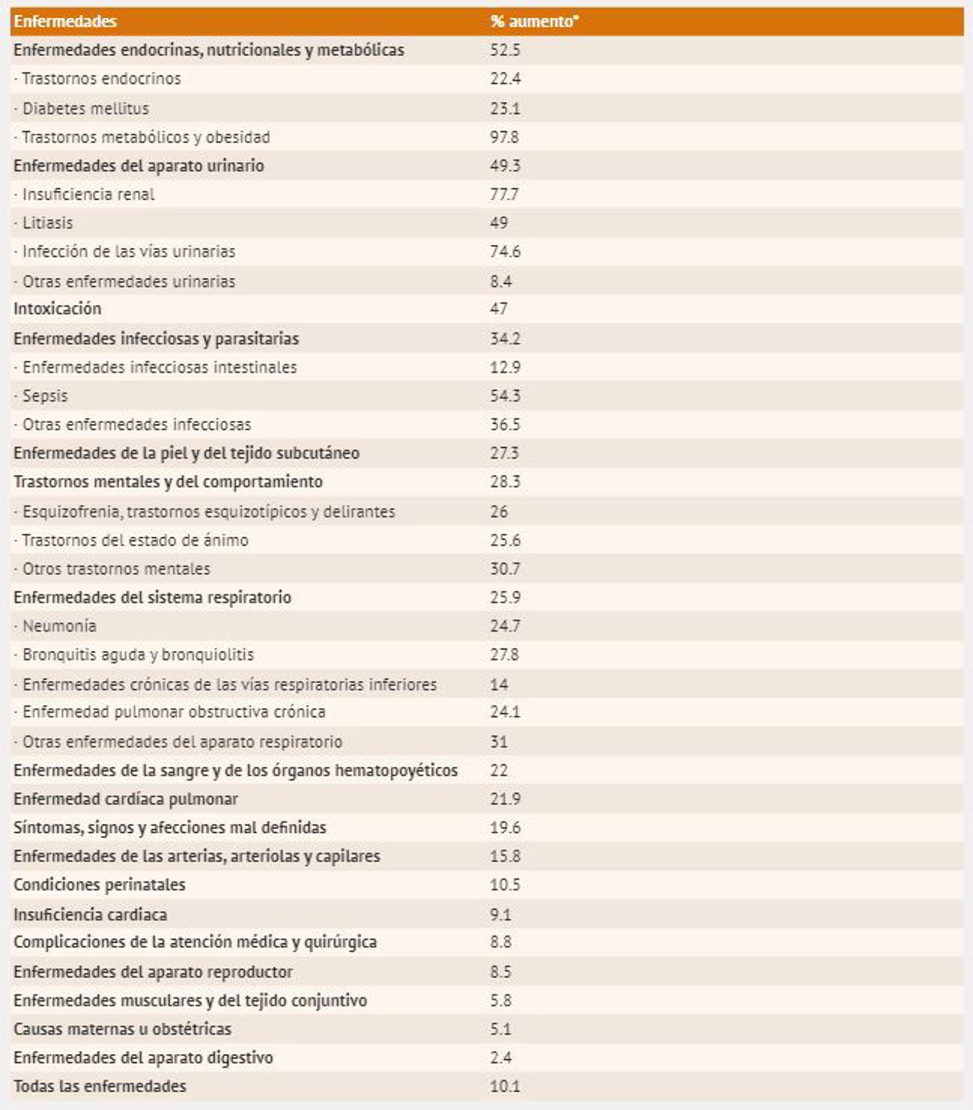 Els resultats de l'estudi indiquen que el risc d'hospitalització augmentava en un 97,8% en temperatures estivals extremes en comparació de les temperatures de confort en el cas dels trastorns metablics i obesitat, seguits de la insuficincia renal (77,7%), la infecció urinria (74,6%) i la spsia o afecció greu davant d'una infecció bacteriana (54,3%).