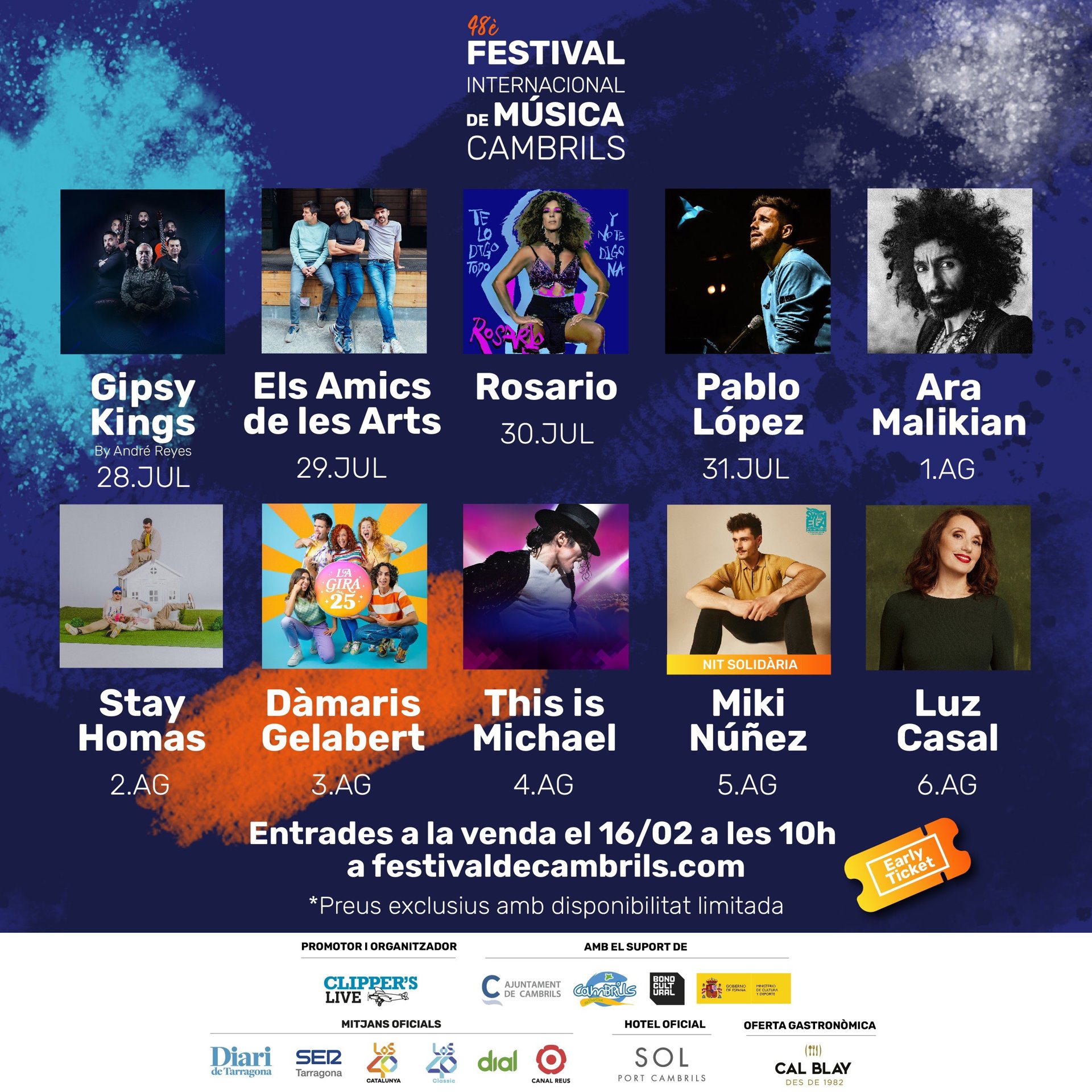 El 48 Festival Internacional de Música de Cambrils (Tarragona), que se celebrar del 28 de juliol al 6 d'agost al parc del Pinaret, comptar en la programació amb Pablo López, Luz Casal, Els Amics de les Arts, un xou sobre Michael Jackson, Stay Homas i Rosario.