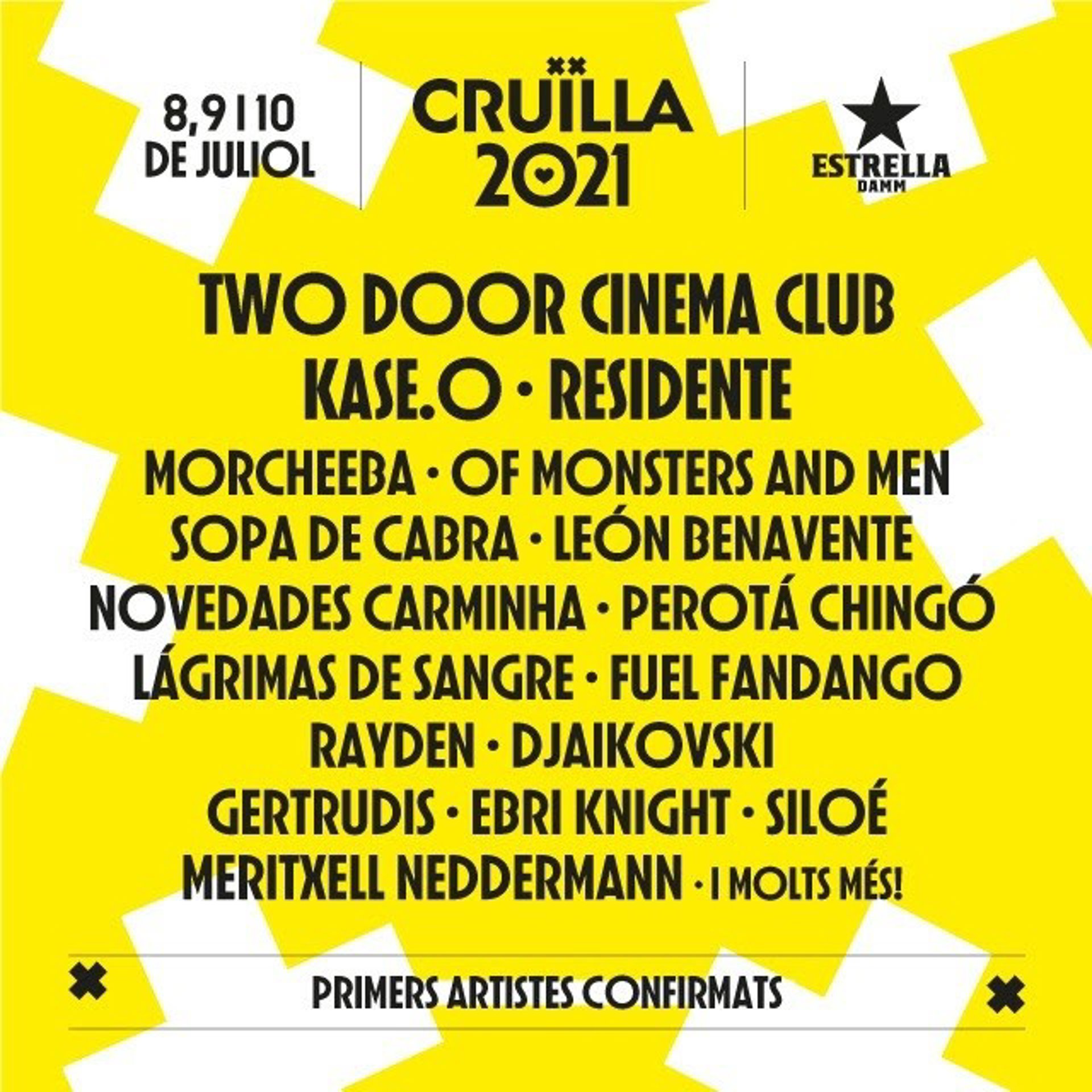 El Festival Crulla de Barcelona ha anunciat aquest dimarts els seus primers noms per a la seva edició del 2021, els dies 8, 9 i 10 de juliol, entre ells Two Door Cinema Club, Kase.O, Residente i Morcheeba.