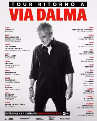 El cantant Sergio Dalma ha anunciat les 22 primeres dates de la gira 'Ritorno a Via Dalma', un tour durant el qual passarà per les localitats catalanes d'Esparreguera (Barcelona), Cervera (Lleida), Tarragona i Barcelona.