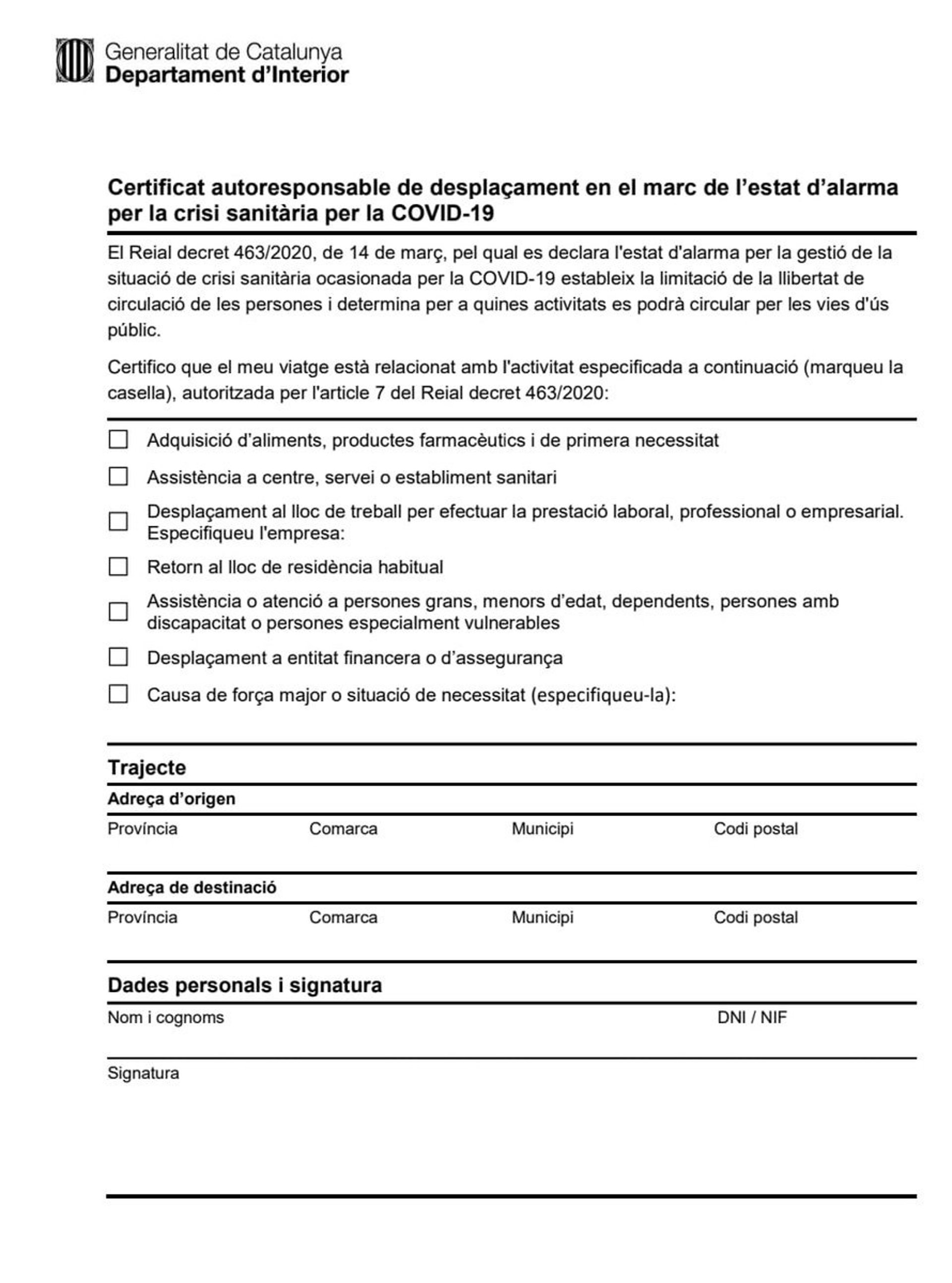 El ciutad ha d'especificar l'adrea d'origen, la de destí i les seves dades personals en aquest document, que "facilitar el treball del ciutad i dels cossos policials que vetllen pel compliment d'aquest confinament".