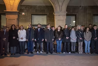 El president de la Generalitat, Salvador Illa; el conseller de Justícia i Qualitat Democràtica, Ramon Espadaler; la presidenta de la Diputació de Barcelona, Lluïsa Moret, i l'alcalde de Manlleu (Barcelona), Arnau Rovira, han encapçalat el minut de silenci per les 5 víctimes mortals de l'incendi d'aquest dilluns.