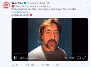 "Sumo la meva veu a la de moltes altres persones que demanem al president espanyol en funcions, Pedro Sánchez, que lideri amb Espanya, país d'origen de l'ONG Open Arms i de tots els seus cooperants, que a risc de les seves prpies vides salven la de moltes altres persones, un procediment de repartiment de totes les persones rescatades en els diferents estats de la Comunitat Europea", reclama Bardem en un vídeo publicat al compte de Twitter de l'ONG Open Arms.