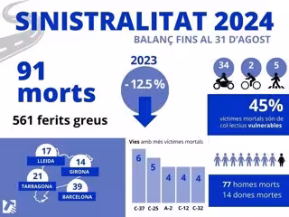 La sinistralitat s'ha reduït a la majoria de les demarcacions respecte del 2023: Barcelona amb 39 víctimes, Tarragona amb 21 i Girona amb 14.