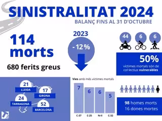 Les carreteres catalanes han registrat 114 morts en 106 accidents de trànsit a la xarxa interurbana de Catalunya en el que va d'any, fins al 31 d'octubre, segons ha informat el Servei Català de Trànsit (SCT) aquest divendres en un comunicat.