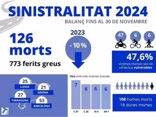 Les carreteres catalanes han registrat 126 morts en 114 accidents de trnsit a la xarxa interurbana de Catalunya en el que va d'any, fins al 30 de novembre, segons ha informat el Servei Catal de Trnsit (SCT) aquest diumenge en un comunicat.