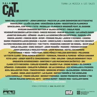 'SALA CAT' s'allargarà durant tot el desembre i ja compta amb 37 sales adherides a 15 ciutats catalanes, on ja s'han programat més de 80 actuacions d'artistes com Albert Pla, Dani Nel·lo, Ebri Knight, Gemma Humet, Mazoni, Mishima, Myriam Swanson o Roger Mas.