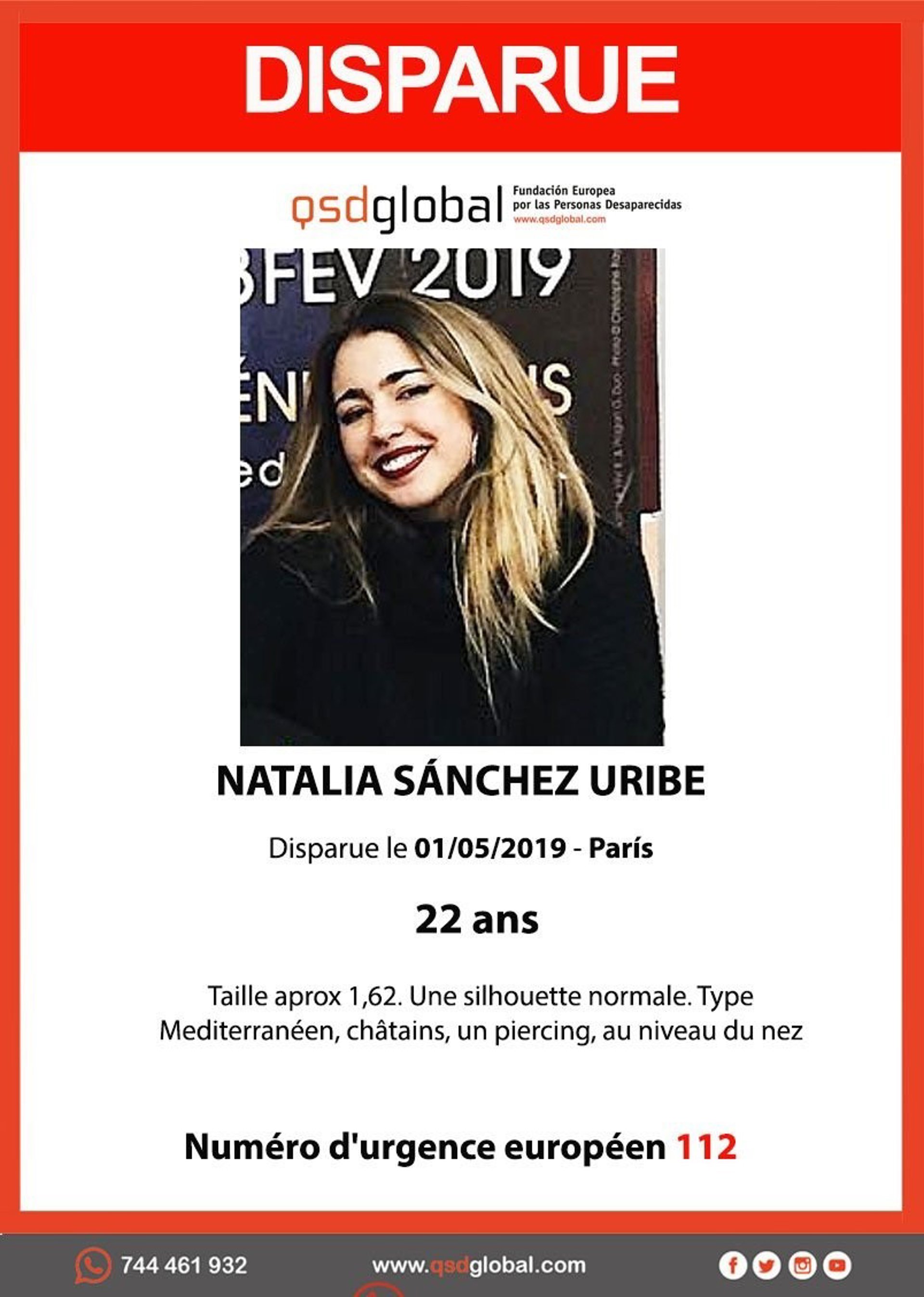 Natalia Sánchez Uribe, la jove espanyola de 22 anys que va desaparixer a París dimecres passat 1 de maig, ha estat trobada en bon estat de salut, segons ha confirmat la Gurdia Civil.