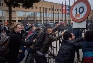 Els manifestants han corejat consignes com 'Som docents, no delinqüents' i 'Menys policia i més educació', i han penjat pancartes a les tanques d'accés amb les seves reivindicacions.