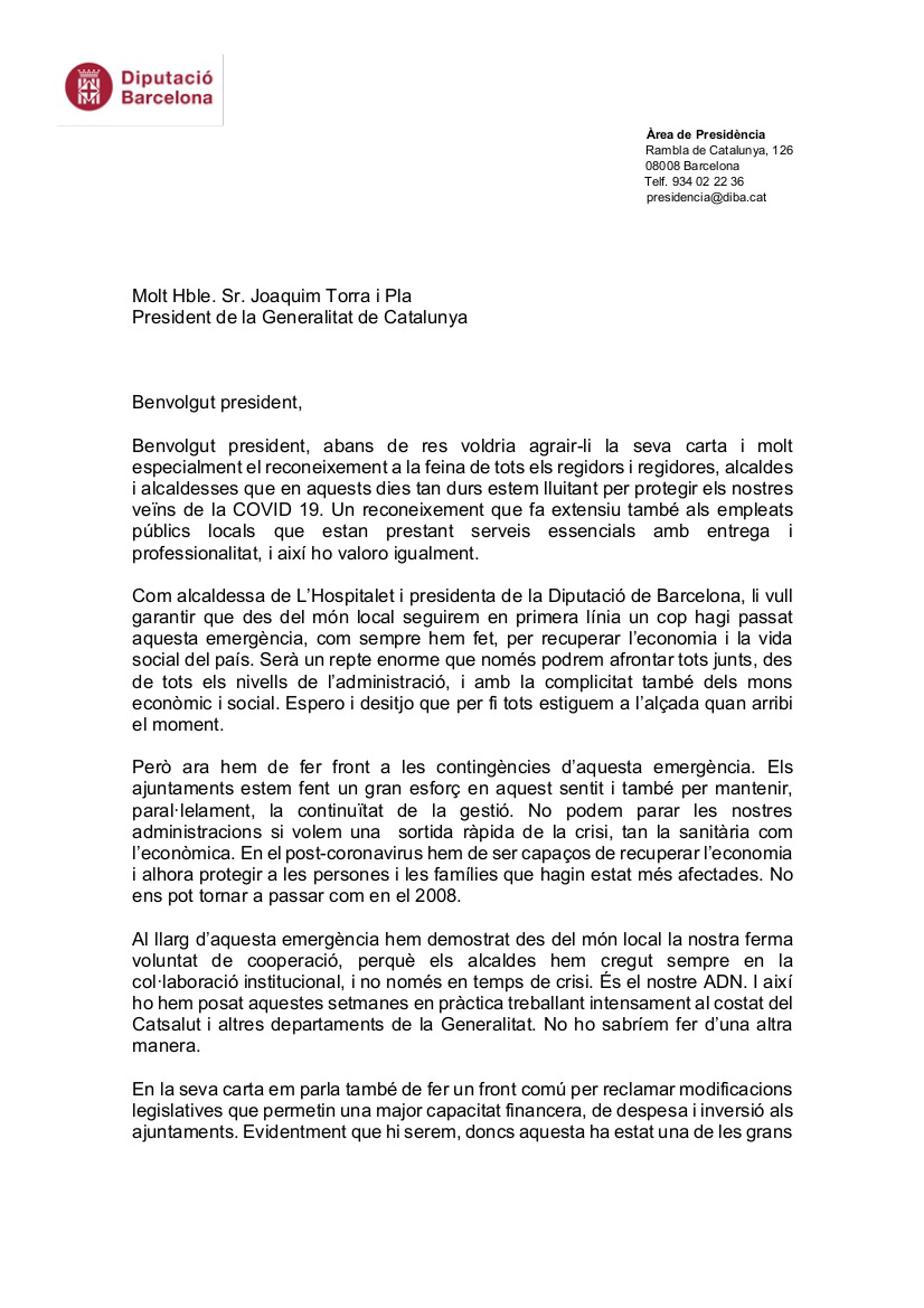 Marín valora en la carta tenir "ara" el suport de la Generalitat en la reivindicació histrica dels governs locals per "fer un front comú per reclamar modificacions legislatives" que permetin més capacitat financera, de despesa i inversió als ajuntaments.