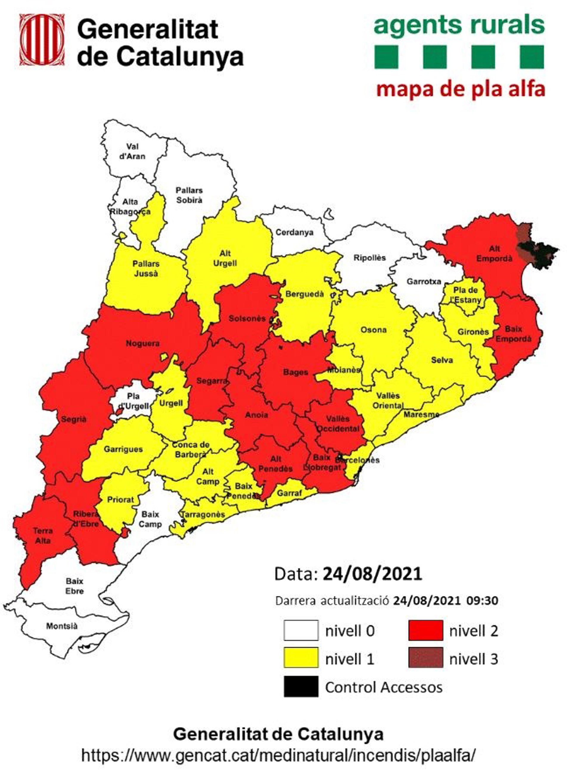 "Hi ha 10 municipis de l'Alt Empord (Girona) en nivell 3 del Pla Alfa", fet que implica la suspensió d'activitats amb el risc d'incendi forestal, i han detallat que en el Barcelons (Barcelona) s'ha passat del nivell 2 a l'1 i al Baix Ebre (Tarragona) del nivell 1 al 0.