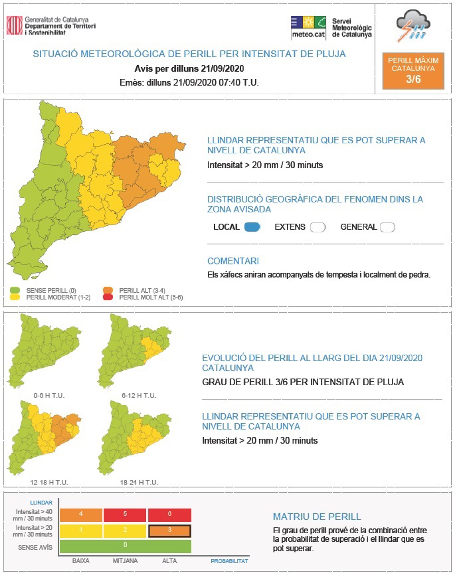 La previsió del Servei Meteorolgic de Catalunya (Meteocat) és que la província de Girona i les comarques d'Osona, el Valls Oriental i el Maresme (Barcelona) superin els 20 litres de pluja per metre quadrat en mitja hora, ha explicat Protecció Civil en un comunicat.