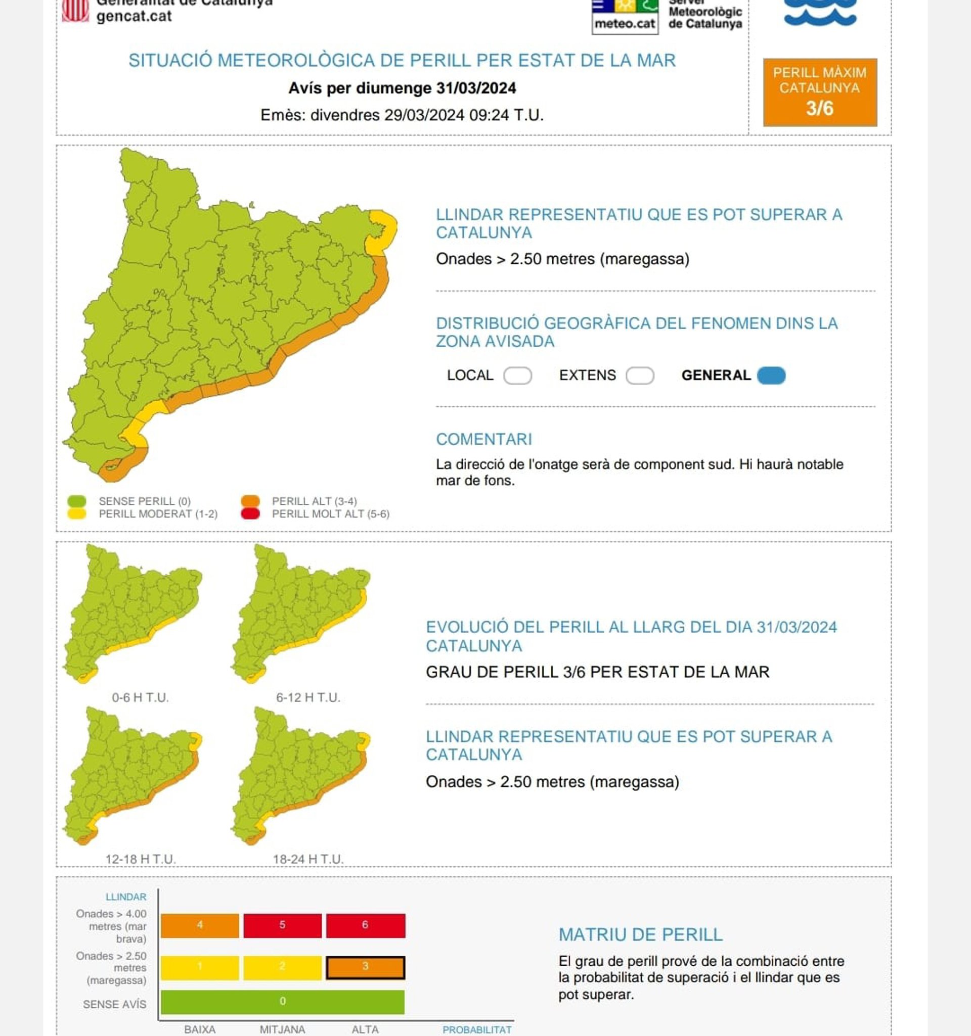 Protecció Civil de la Generalitat ha informat aquest divendres d'avís d'onatge a Catalunya aquest diumenge i continua activat el pla especial d'emergències per risc de vent a Catalunya (Ventcat) en diverses comarques de Lleida i Girona.