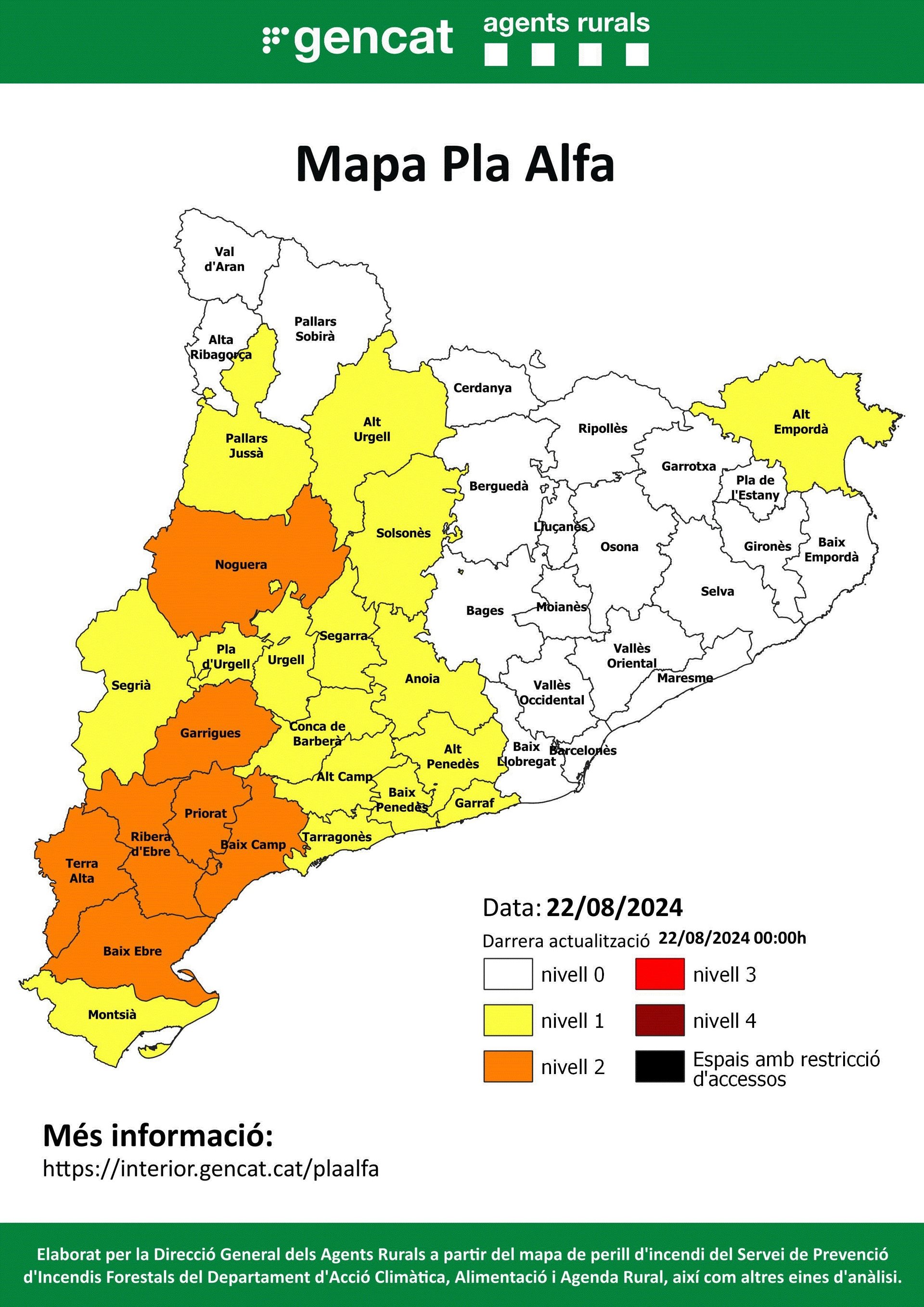 Aquest mapa mostra els nivells de risc d'incendi en municipis i comarques de Catalunya en el marc del Pla Alfa, i a la província de Lleida, aquest dijous estan en nivell 2 (risc alt) les comarques de les Garrigues i la Noguera.