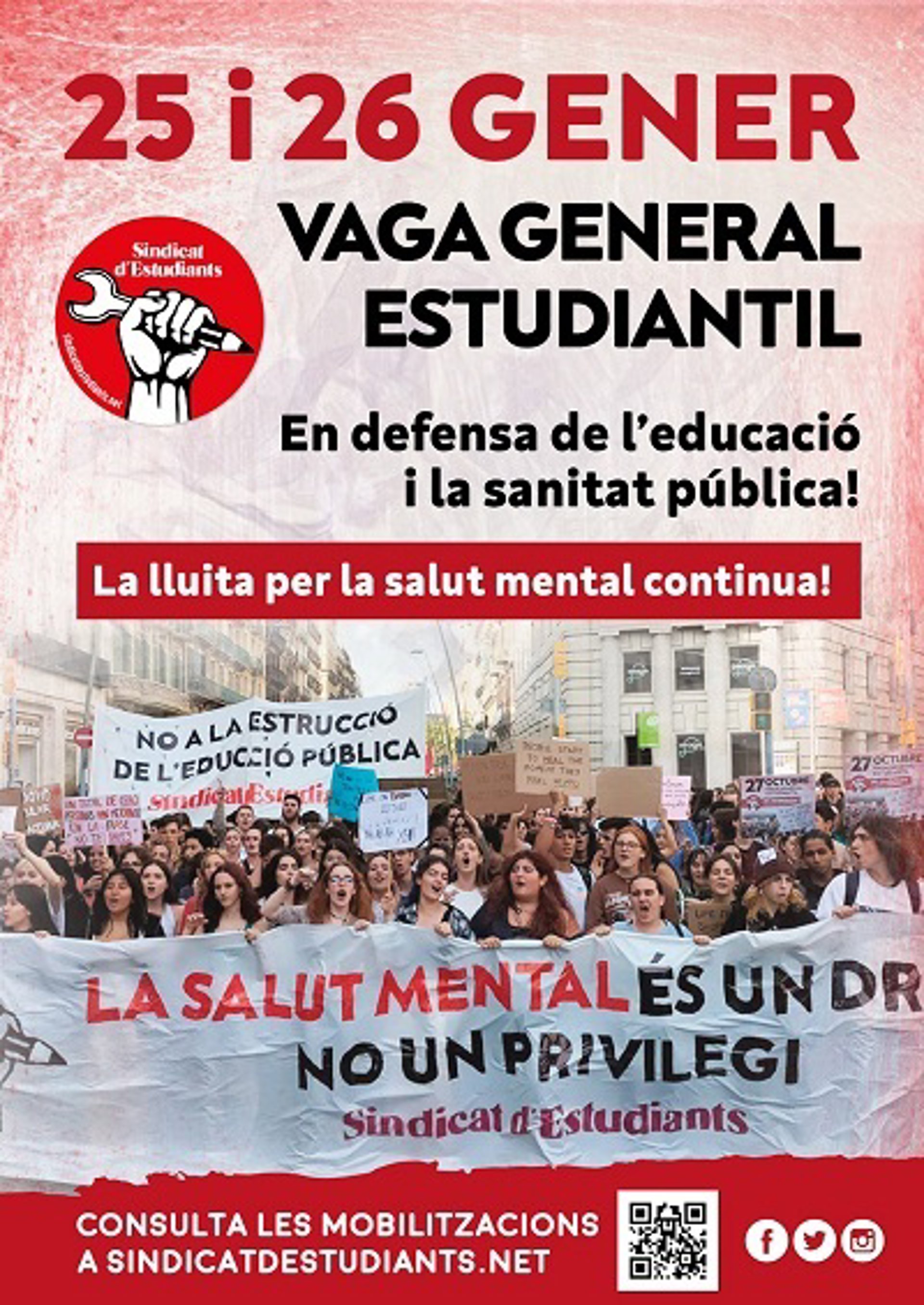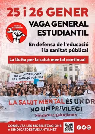 El Sindicat d'Estudiants (SE) ha anunciat dues jornades de vaga estudiantil per al 25 i 26 de gener --que coincideix amb els dies d'aturada convocats per UstecStes i per la Intersindical-- per reclamar una "educació pública 100% gratuta, de qualitat i en catal des d'infantil fins a la universitat", per reduir les rtios de les aules i en defensa de la salut mental, entre altres reivindicacions.