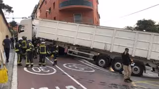 Bombers de Barcelona i una grua de Transports Metropolitans de Barcelona (TMB) treballen per retirar un camió articulat que ha quedat entravessat enmig de la calada i ha bloquejat la crulla dels carrers Lorda i el passeig de la Mare de Déu del Coll, al districte d'Horta-Guinardó.