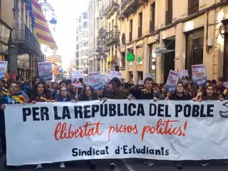 Convocats en solitari pel Sindicat d'Estudiants, la marxa, sota la pancarta 'Per la república del poble. Llibertat presos polítics' ha recorregut des de la plaa Universitat a la plaa Sant Jaume, amb consignes com 'Aquest judici és una farsa' i '1-O, ni oblit ni perdó'.