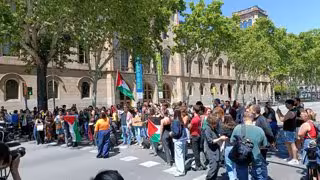Uns 80 estudiants universitaris han tallat aquest dimecres durant mitja hora la Gran Via de Barcelona davant l'edifici històric de la Universitat de Barcelona (UB) en solidaritat amb Palestina i en el marc de l'acampada d'aquests dies a la universitat per la mateixa causa.
