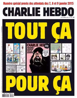 El dimecres comena el judici contra els suposats cmplices de la massacre a la seu de la publicació, en el qual van morir dotze persones. La revista ha publicat en portada les caricatures que van justificar l'atac per als integristes sota el titular: "Tot aix per aix".